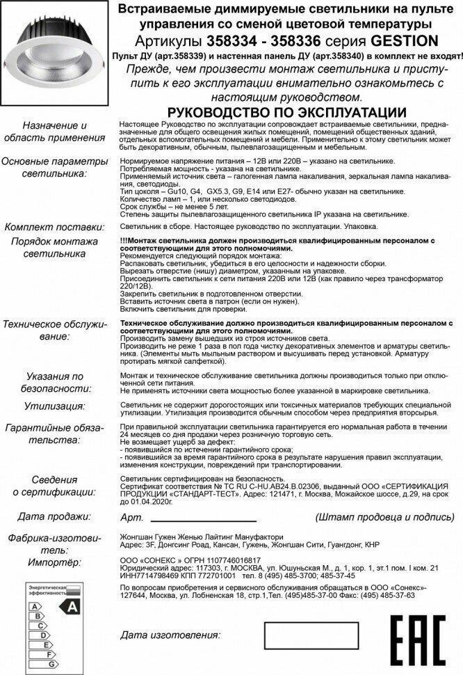 | Комплектация | Встраиваемые светильники Novotech 358336 |