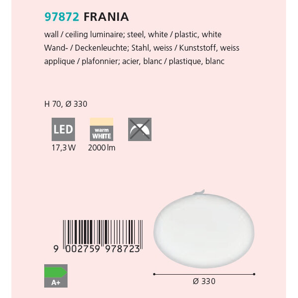 Cветод. настенно-потолочный светильник FRANIA-S, 17,3W (LED), 2000lm, Ø330, H70, cталь, белый/пластик, белый