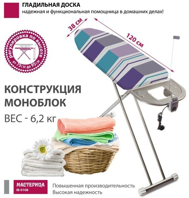 Доска гладильная мастерица IB-0108+доп. чехол, 38*120см, материал: сталь, хлопок, поролон; столешница: метал. моноблок; розетка с удл, подру