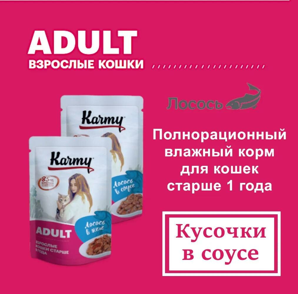 Консервы для кошек Karmy ADULT для кошек старше 1 года Лосось в соусе, паучи (80 г x 24 шт)