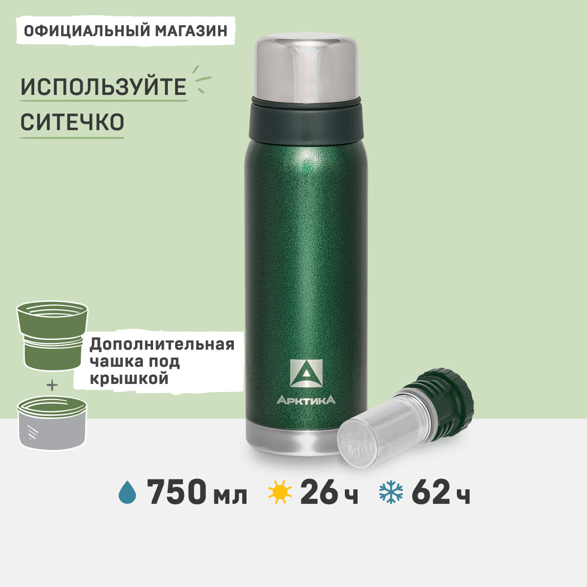 Купить Термос Арктика 106-750C зеленый с ситечком, 0,75л, 26ч .