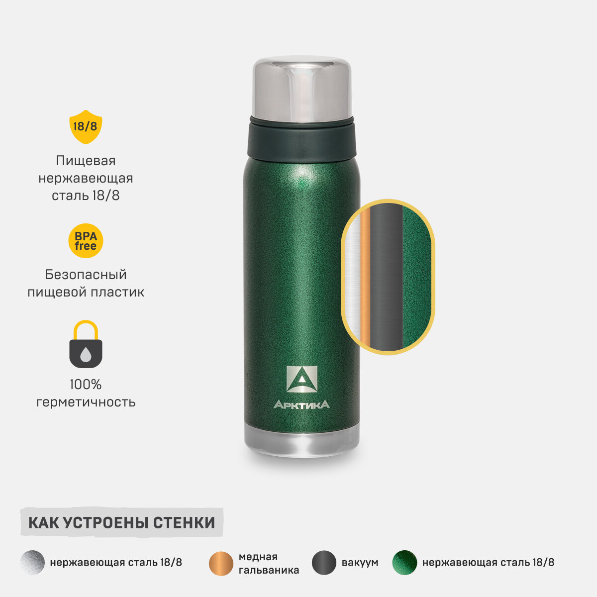 Арктика Термос с узким горлом и глухой пробкой со съемным ситечком, 2 накручивающиеся чашки в комплекте, объем 0,9 л.зелёный 106-900C GN