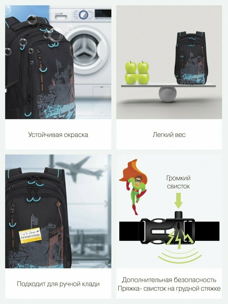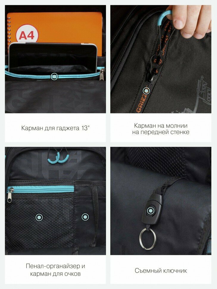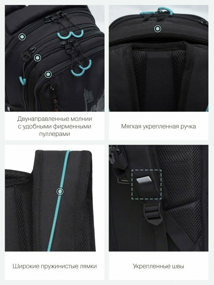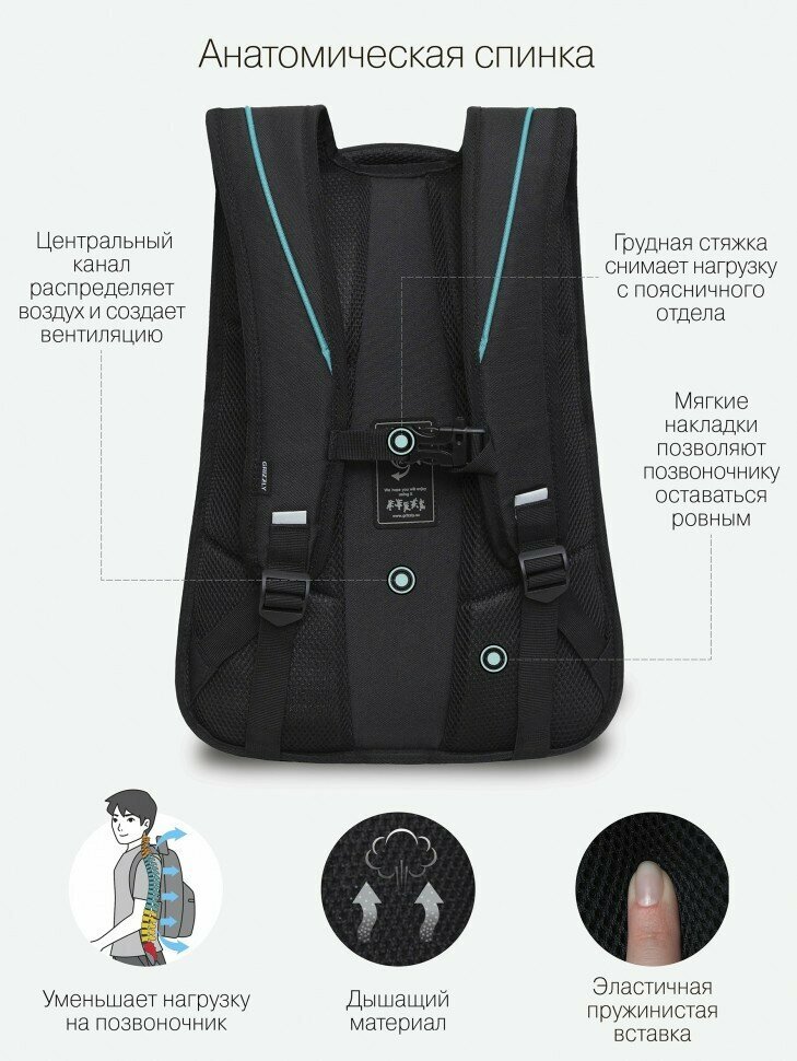 Рюкзак молодёжный, 42 х 31 х 22 см, Grizzly 338, эргономичная спинка, отделение для ноутбука, чёрный/бирюзовый RU-338-1_2