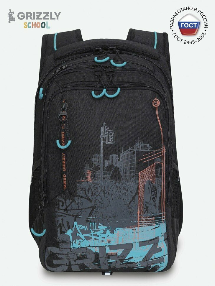 Школьный рюкзак с ортопедической спинкой GRIZZLY RU-338-1 черный - бирюзовый, грудная стяжка, 3 отделения, 42x31x22см, 17л.