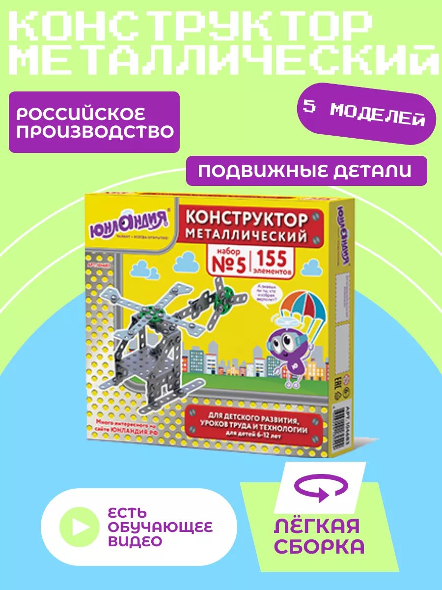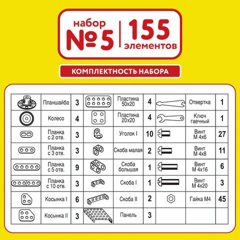 Комплект 5 шт, Конструктор металлический юнландия "Для уроков труда №5", развивающий, 155 элементов, 104683