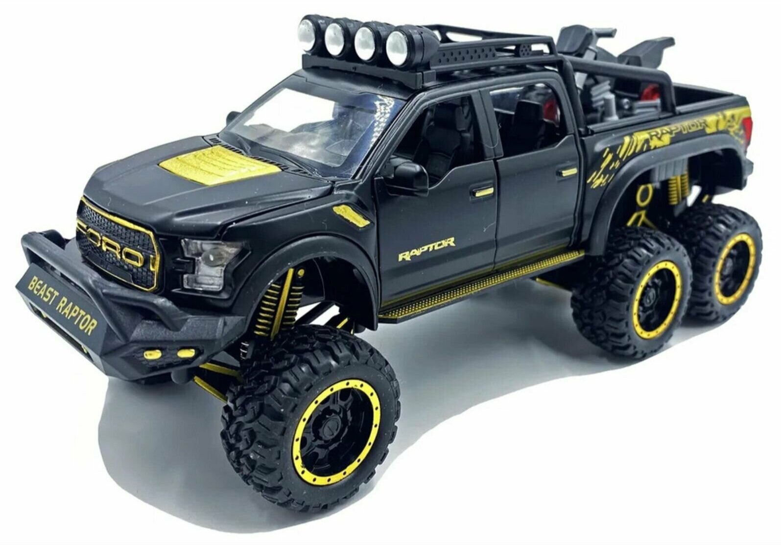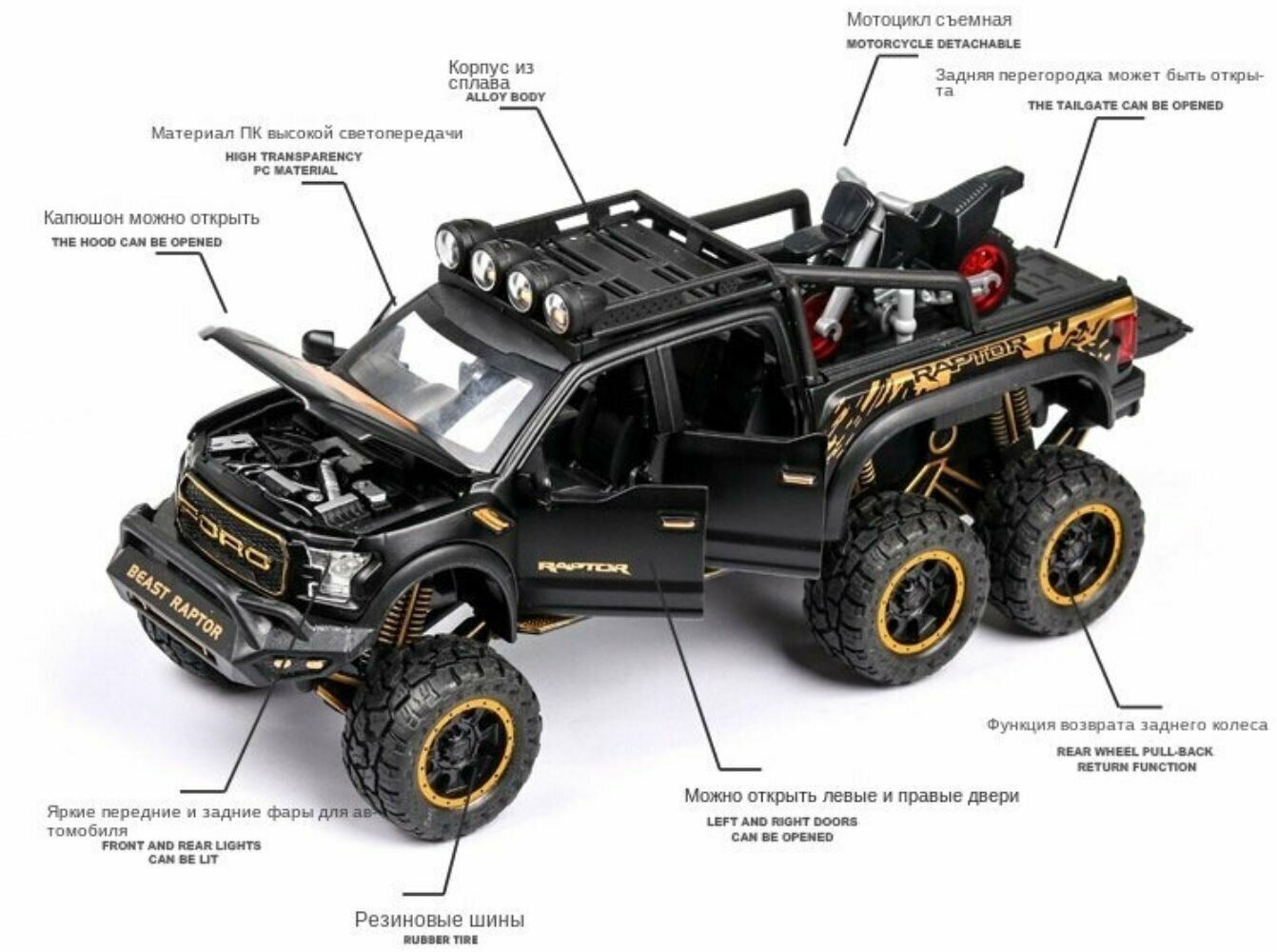 Коллекционная модель форд раптор F150 (FORD RAPTOR F 150) с мотоциклом ( металл, свет звук), чёрный цвет
