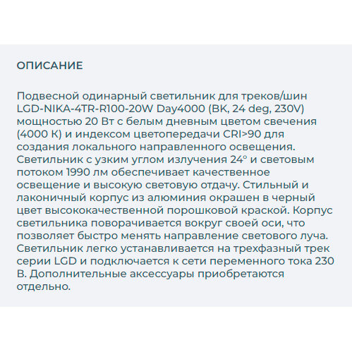 Купить 031111 Светильник LGD-NIKA-4TR-R100-20W Day4000 (BK, 24 deg, 230V) (ARL, IP20 Металл)