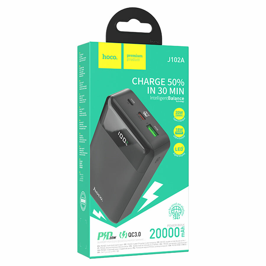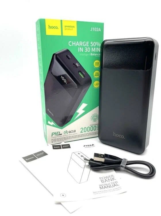 Универсальный Доп. Аккумулятор 20000mAh, J102A, HOCO, выход: 1 USB (18W)+1 PD 20W, черный