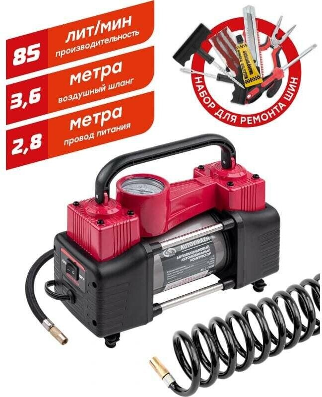 Купить Компрессор двухцилиндровый 85 лмин в кейсе с набором для ремонта колес, пневм. шланг autovirazh, AUTOVIRAZH AV010890 (1 шт.)