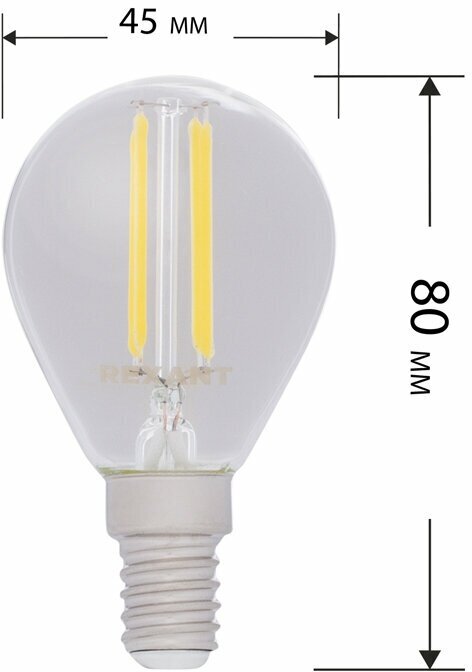 Лампа филаментная Rexant Шарик GL45, 7.5 Вт, 600 Лм, 2700K, E14 в прозрачной колбе