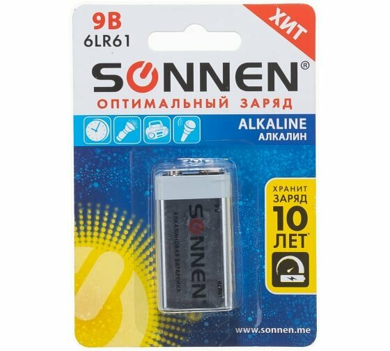 Батарейка Sonnen Alkaline, Крона (6LR61, 6LF22, 1604A), алкалиновая, 1 шт., блистер, 451092