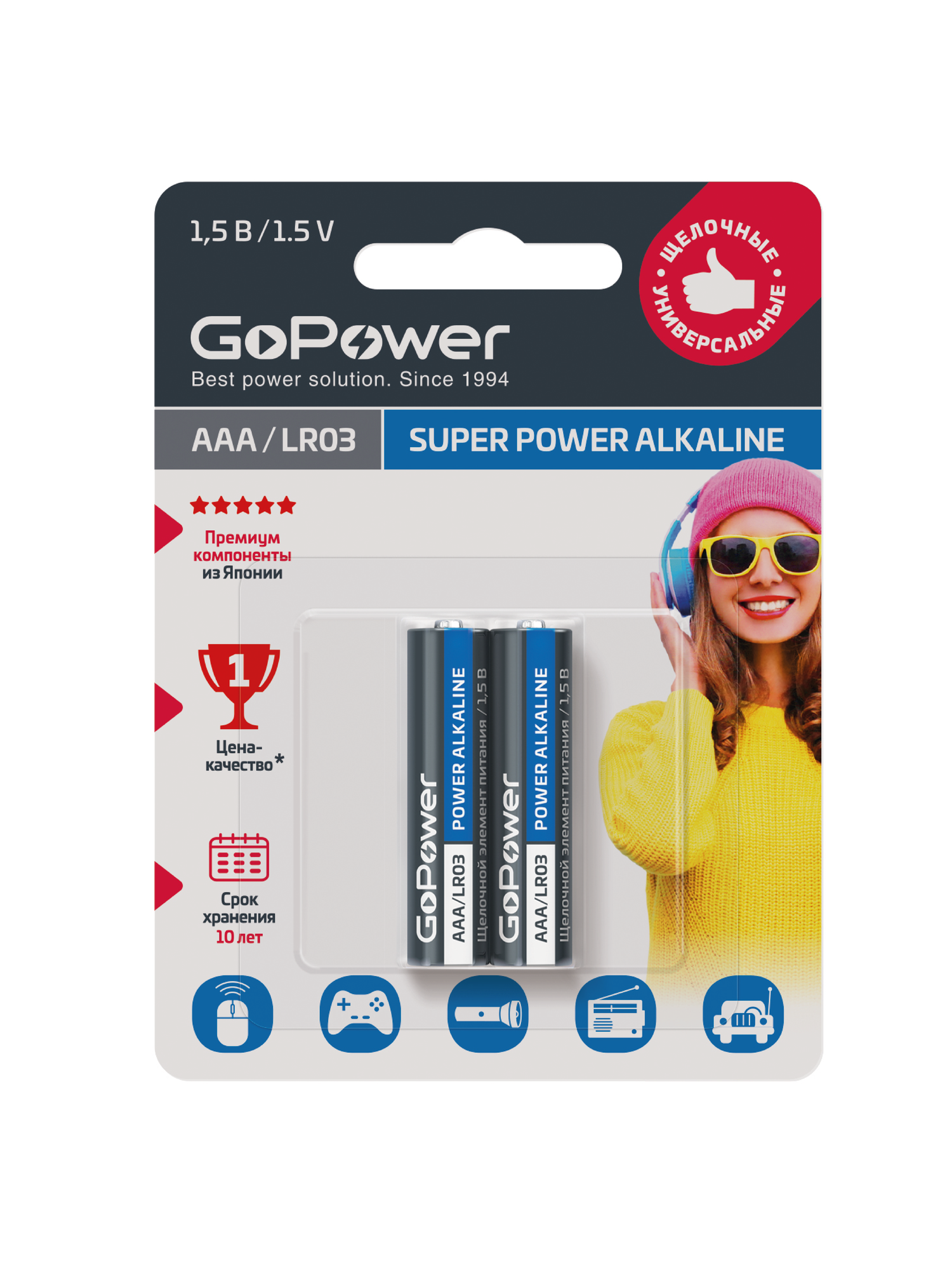 Купить 00-00015600 Super Power Alkaline Элемент питания AAA/LR03 щелочной 1.5В, 2шт, GoPower