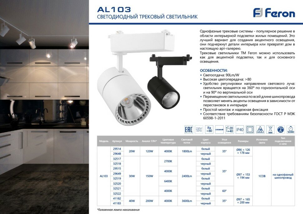 Светодиодный светильник AL103 трековый однофазный на шинопровод 30W 4000K, 35 градусов, черный, FERON 29649 (1 шт.)