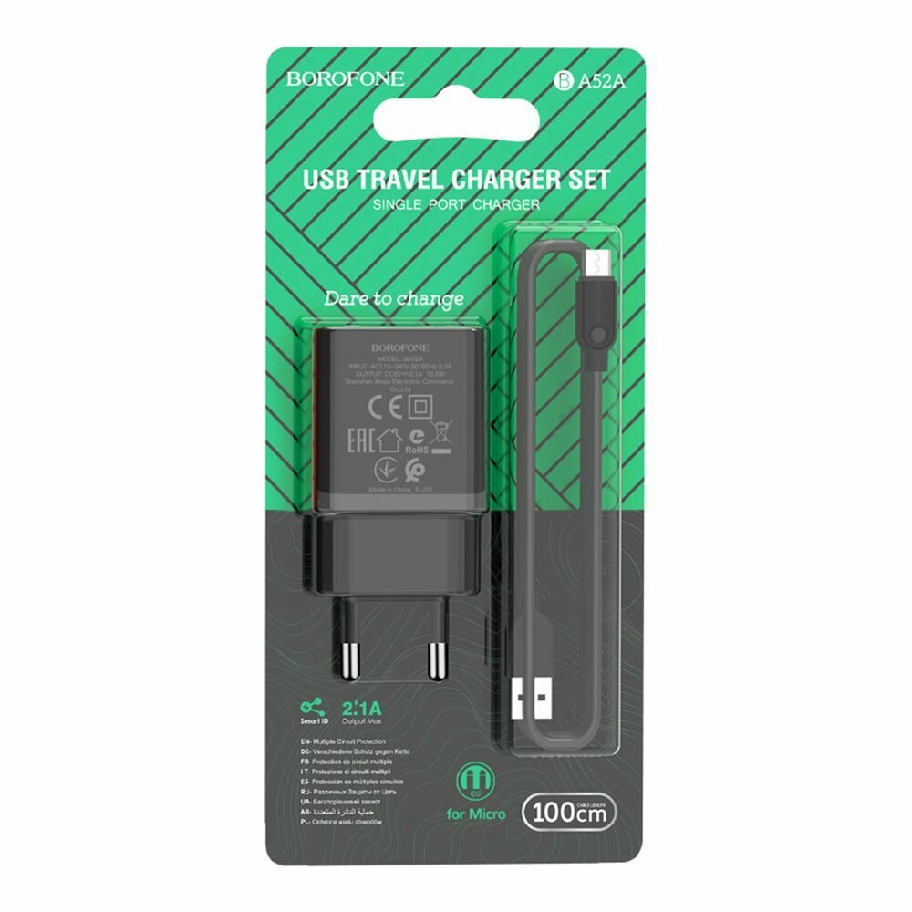 Сетевое зарядное устройство (СЗУ) Borofone BA52A (USB) + кабель MicroUSB, 2.1 А, черный