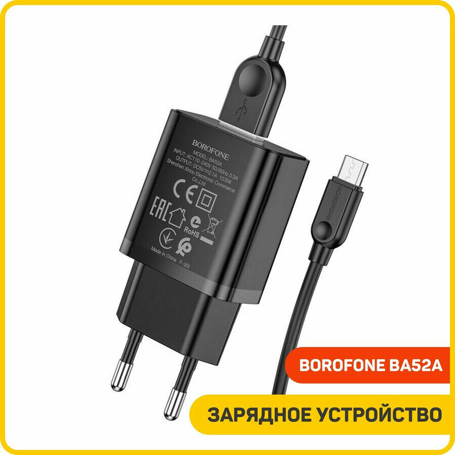 Купить Сетевое зарядное устройство Borofone BA52A Gamble + кабель MicroUSB, 10.5 Вт, черный