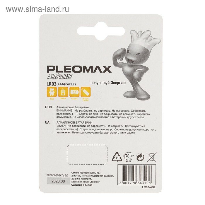 PLEOMAX Батарейка PLEOMAX LR03 BL4, 4шт