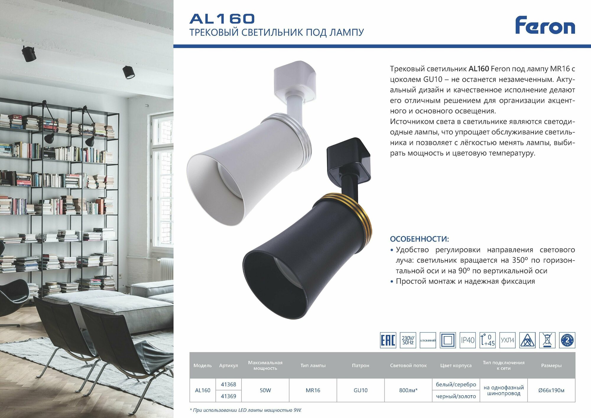 Трековый светильник Feron AL160, кол-во ламп: 1 шт., цвет арматуры: черный, цвет плафона: черный