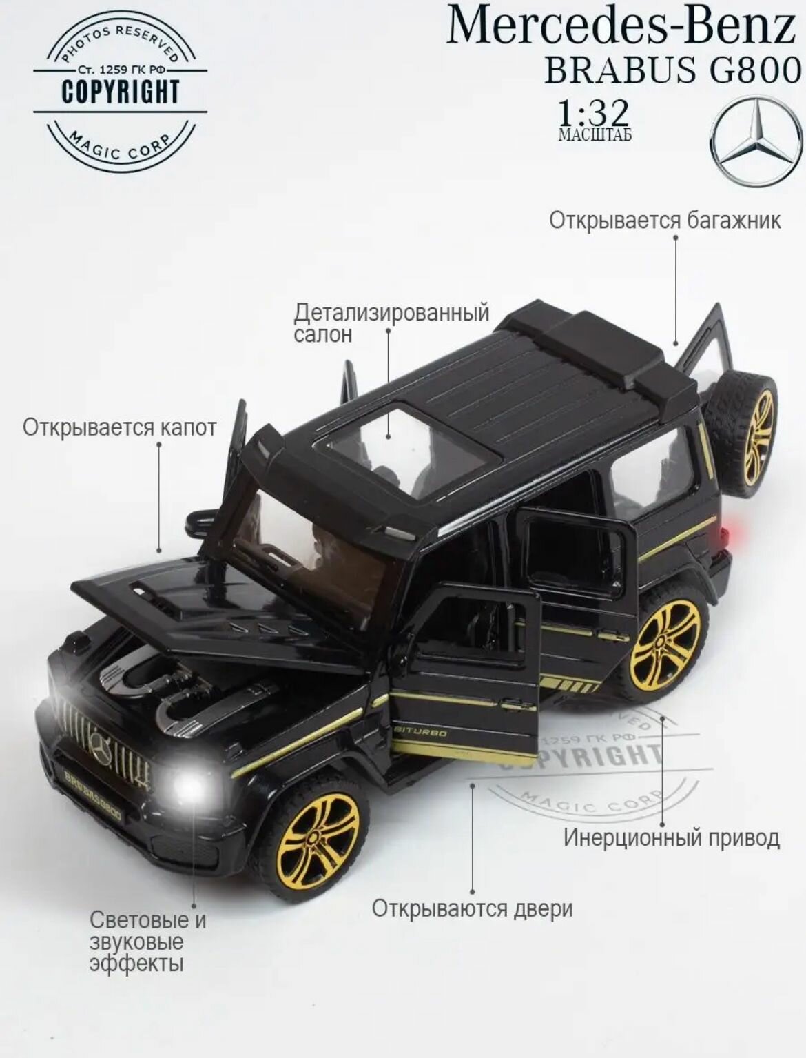 батарейки в комплекте / коллекционная / открывается капот/багажник / открываются дверцы / звук / звук / свет