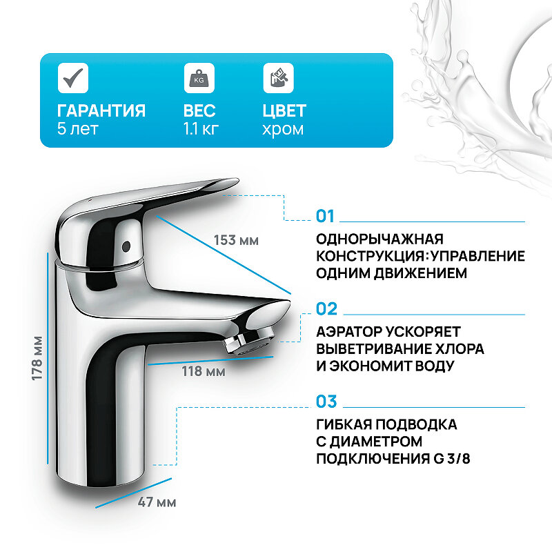 Смеситель для умывальника Hansgrohe Novus, арт. 71031000, неповоротный излив, без донного клапана, высота излива 9,8 см