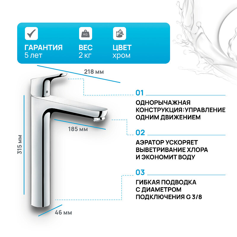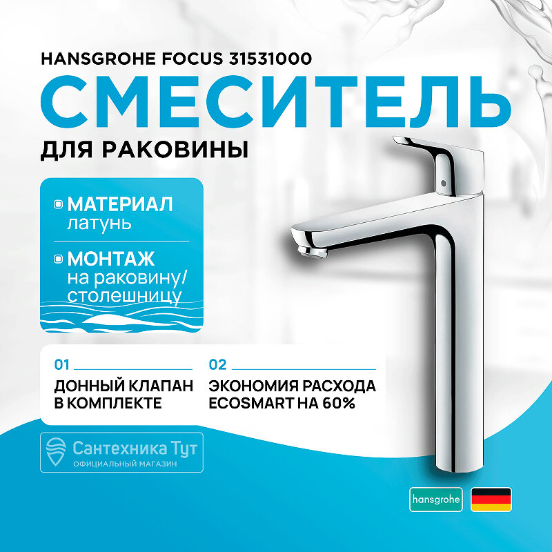Смеситель для раковины Hansgrohe Focus высокий, с донным клапаном, хром (31531000)