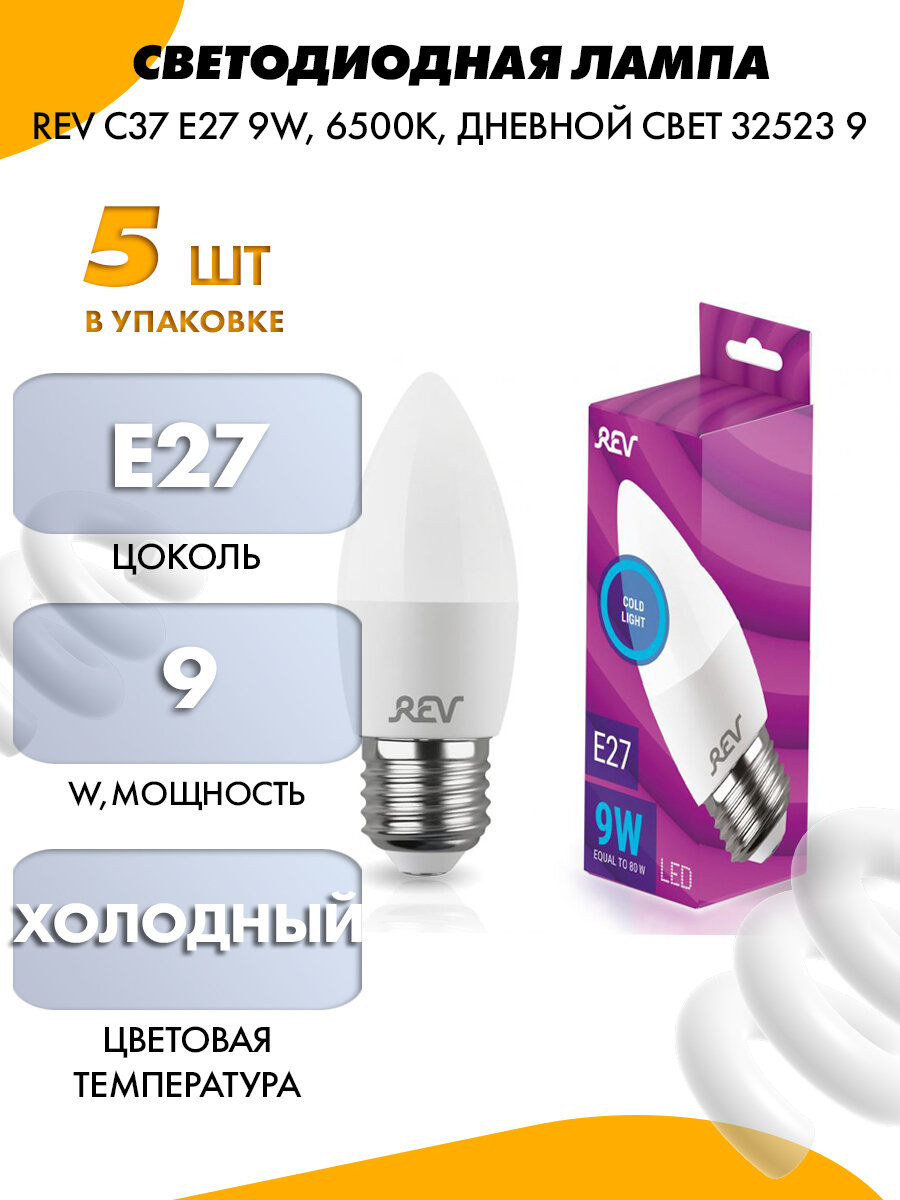 Лампа сд свеча C37 9 Вт, Е27, 6500K, 720 Лм, REV упаковка 5 шт. 32523 9up5