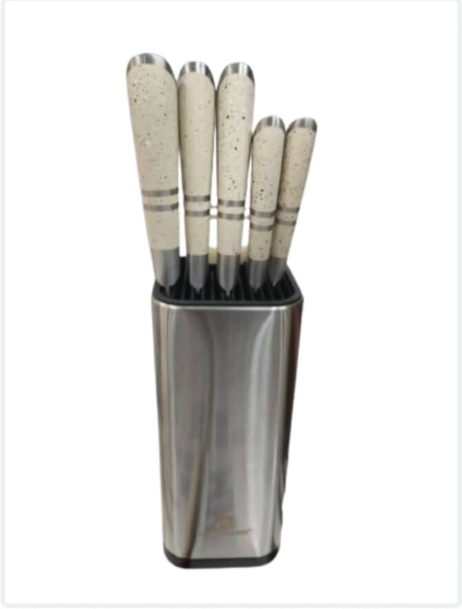 | Комплектация | Поварской нож, универсальный нож, нож для хлеба, нож для нарезки, нож для чистки овощей и фруктов, керамический пиллер, крутящаяся акриловая подставка. |