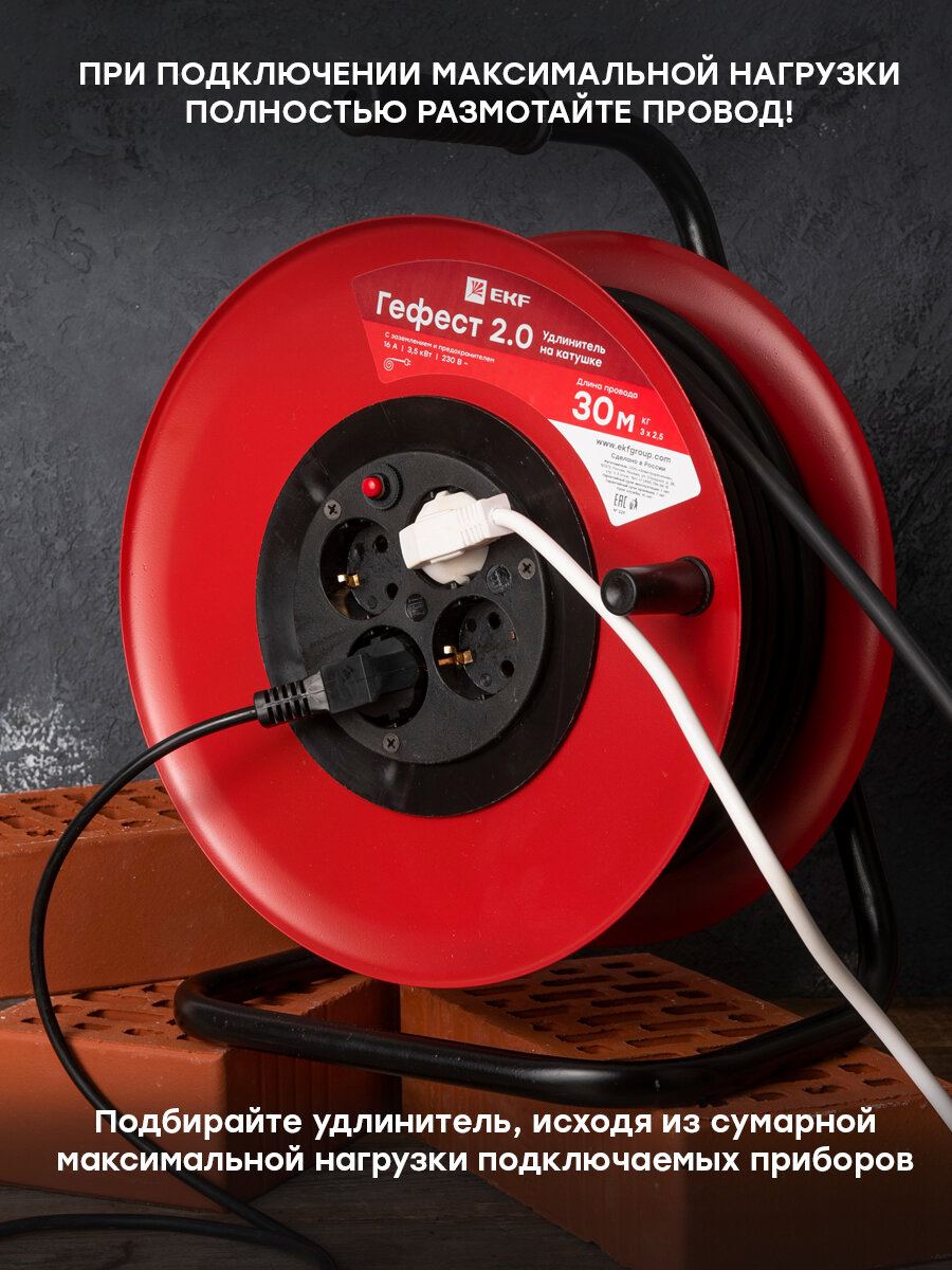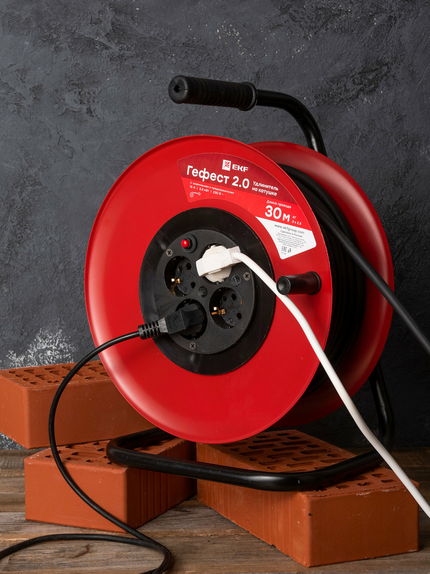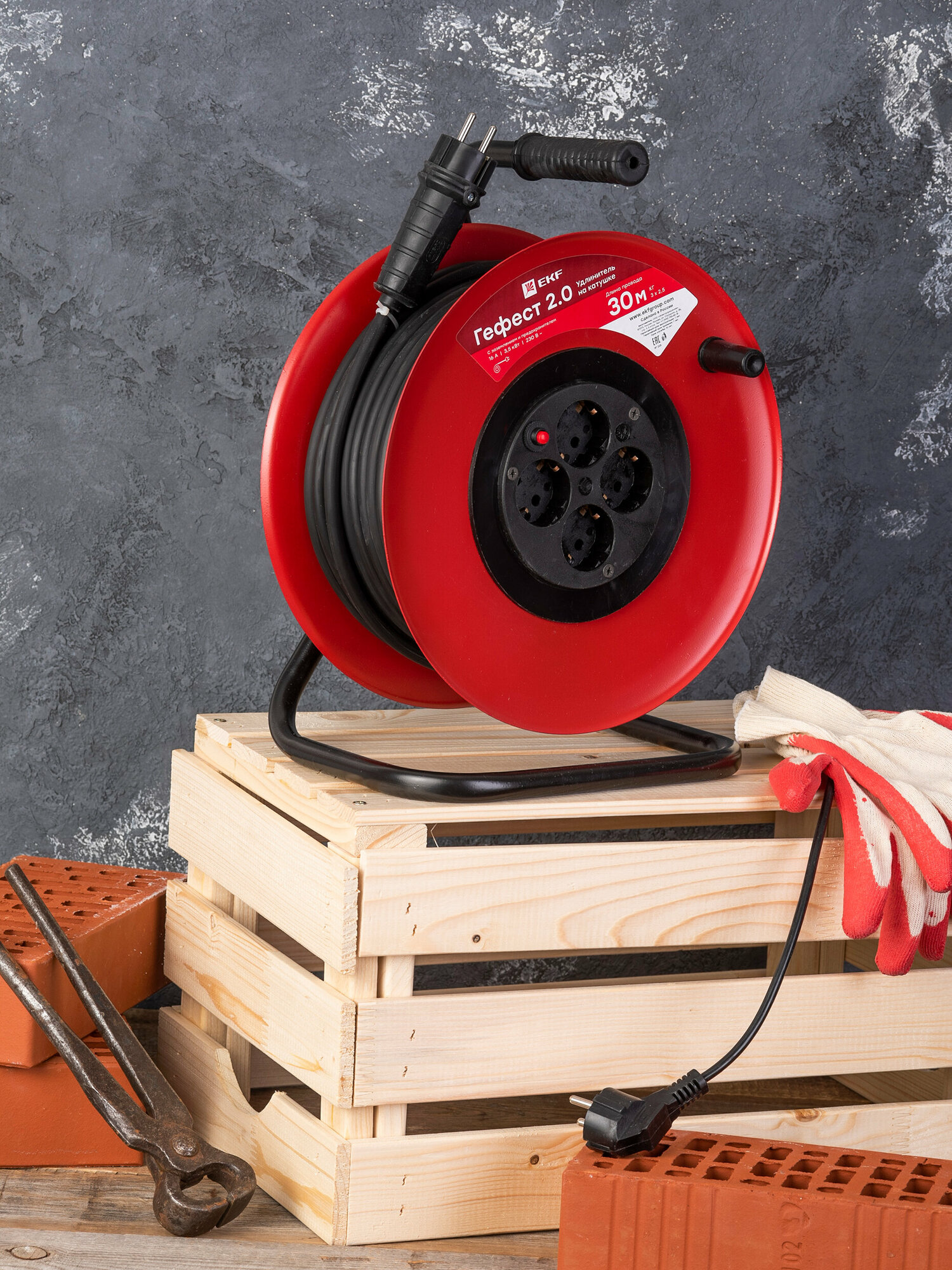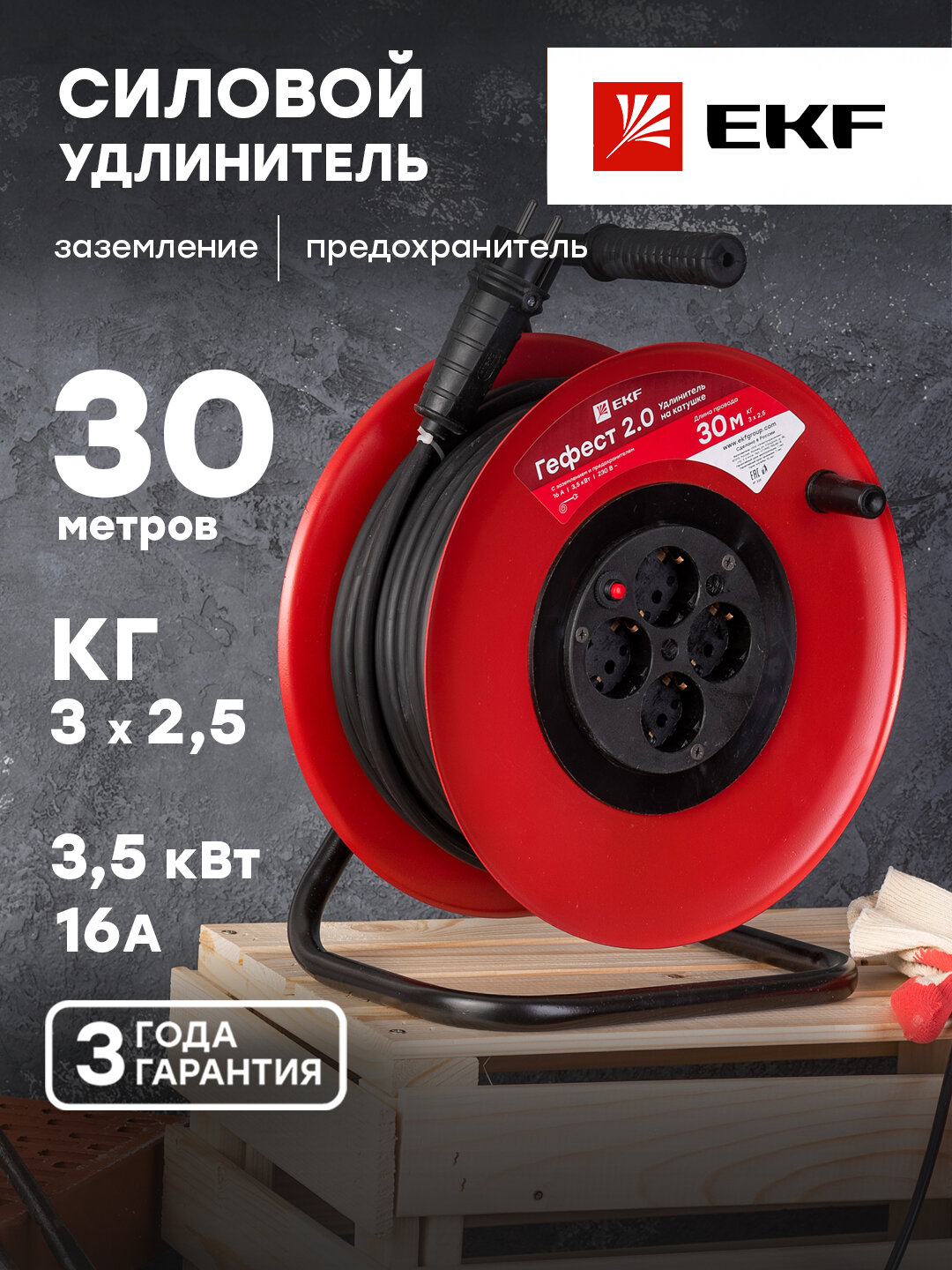 Удлинитель на катушке Гефест 2.0 4 гнезда 30м с заземлением и предохранителем КГ 3x2.5 16А/3.5кВт PROxima , EKF UKG02-16-R325-4-30 (1 шт.)