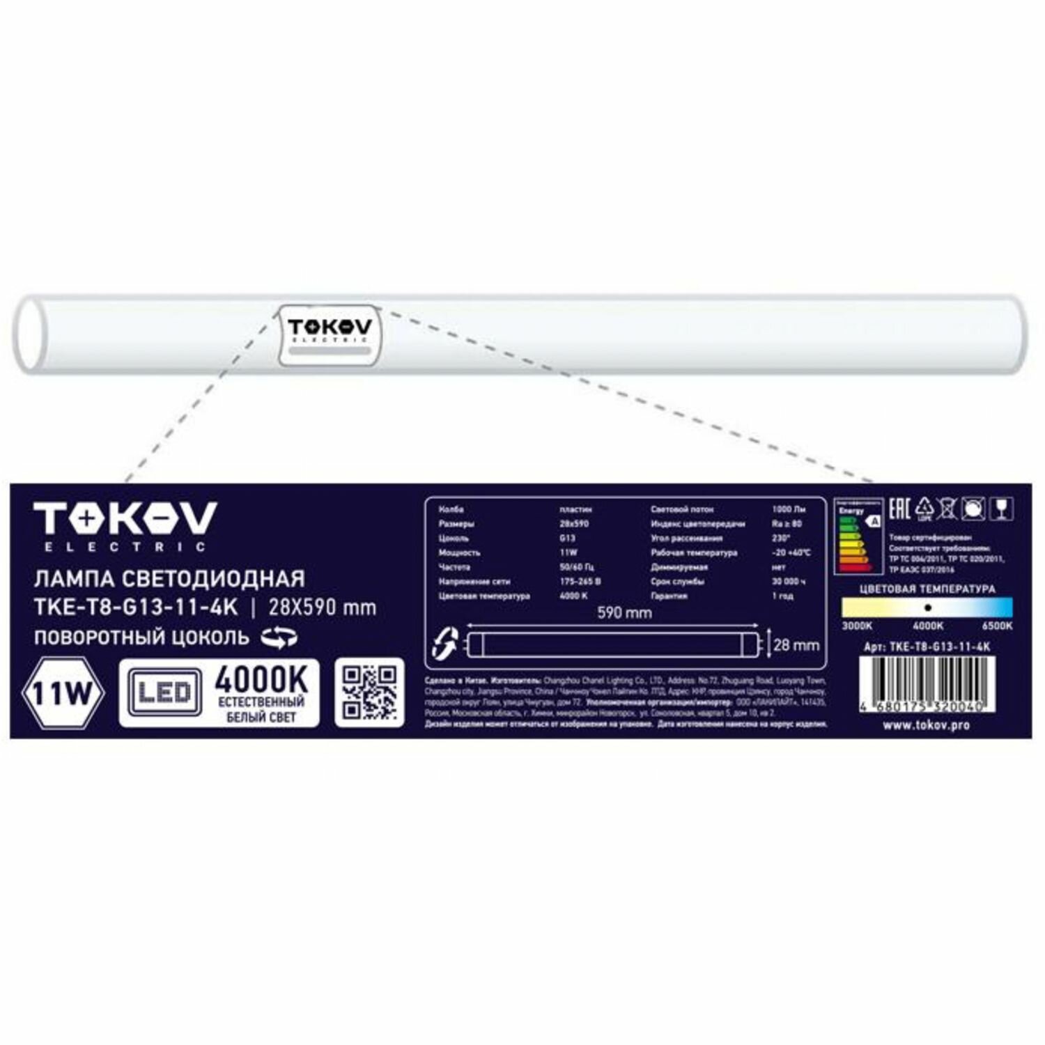 Лампа светодиодная 11Вт линейная T8 4000К G13 176-264В TKE-T8-G13-11-4K TOKOV ELECTRIC интересное: