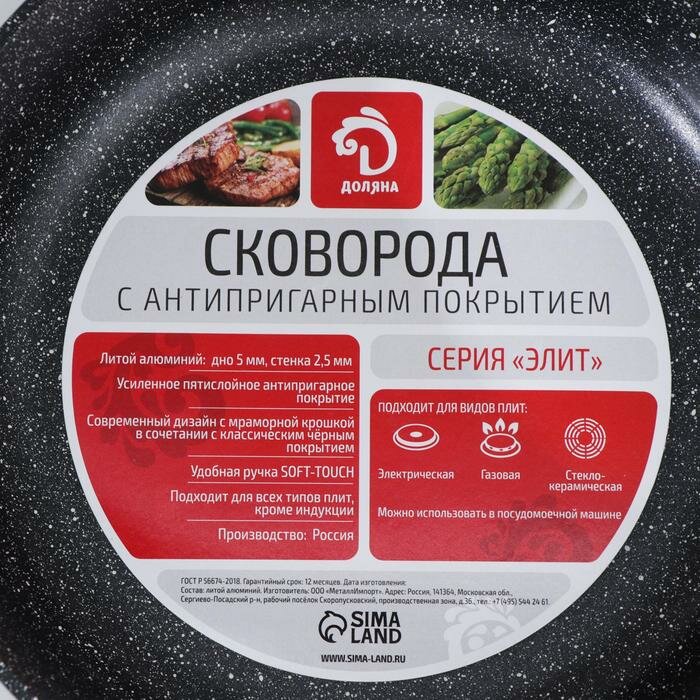 Сковорода Доляна Элит, d=24 см, пластиковая ручка, стеклянная крышка, антипригарное покрытие, цвет .