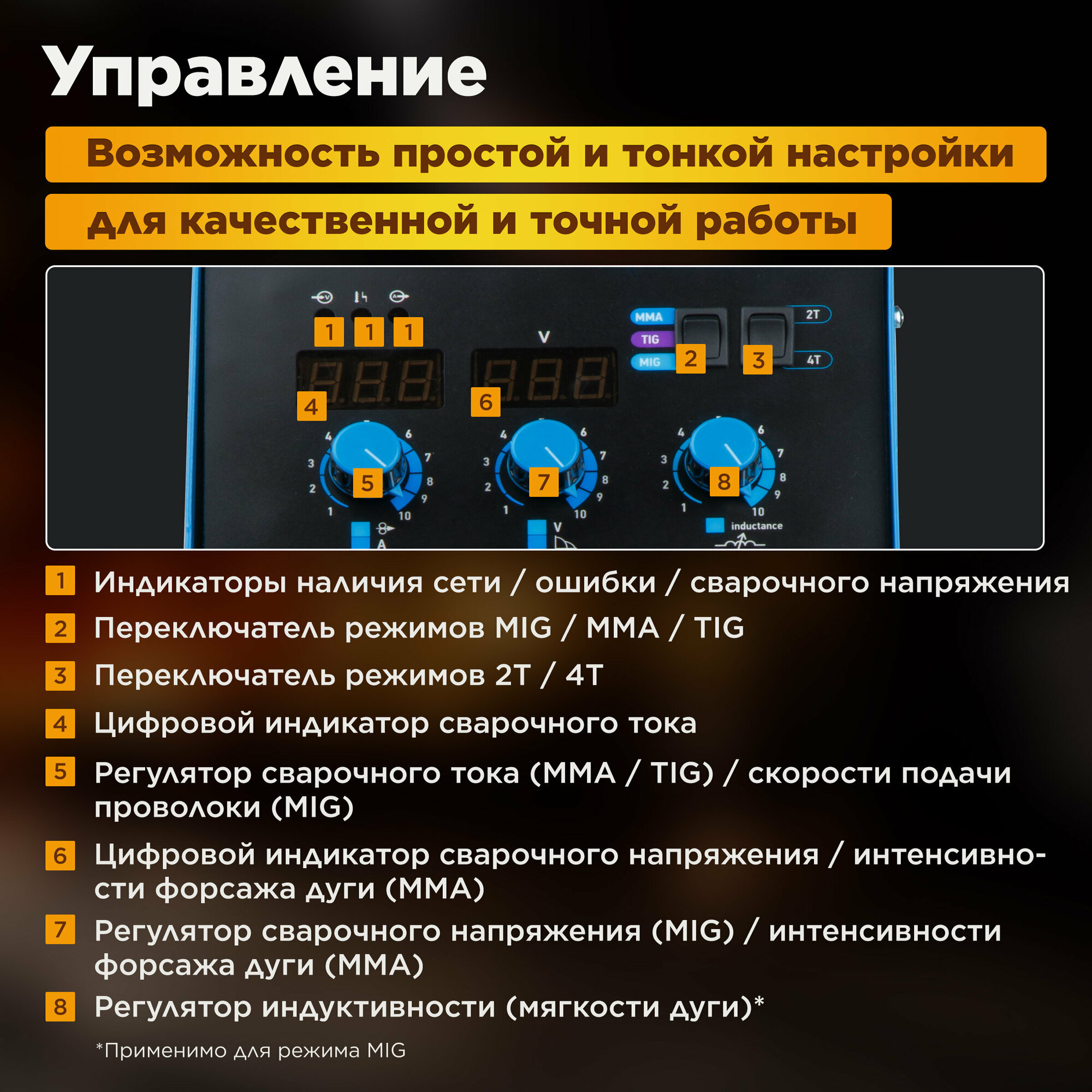 | Полуавтоматическая сварка (MIG/MAG) | есть |