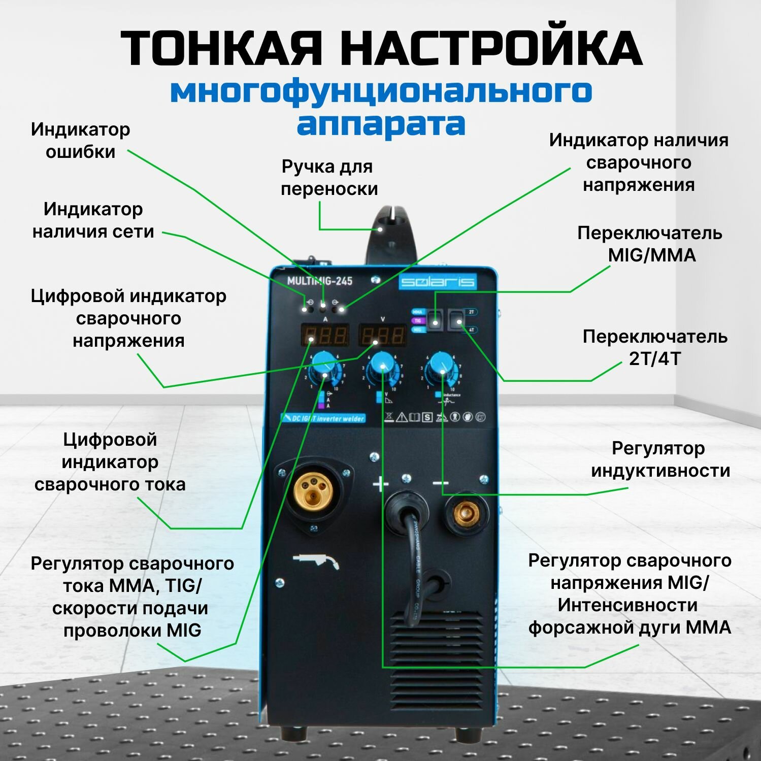 Полуавтомат сварочный Solaris MULTIMIG-245 (220В, MIG/FLUX/MMA/TIG, евроразъем, горелка 3 м, смена полярности, 2T/4T, рег-ка индуктивн.) (SOLARIS)