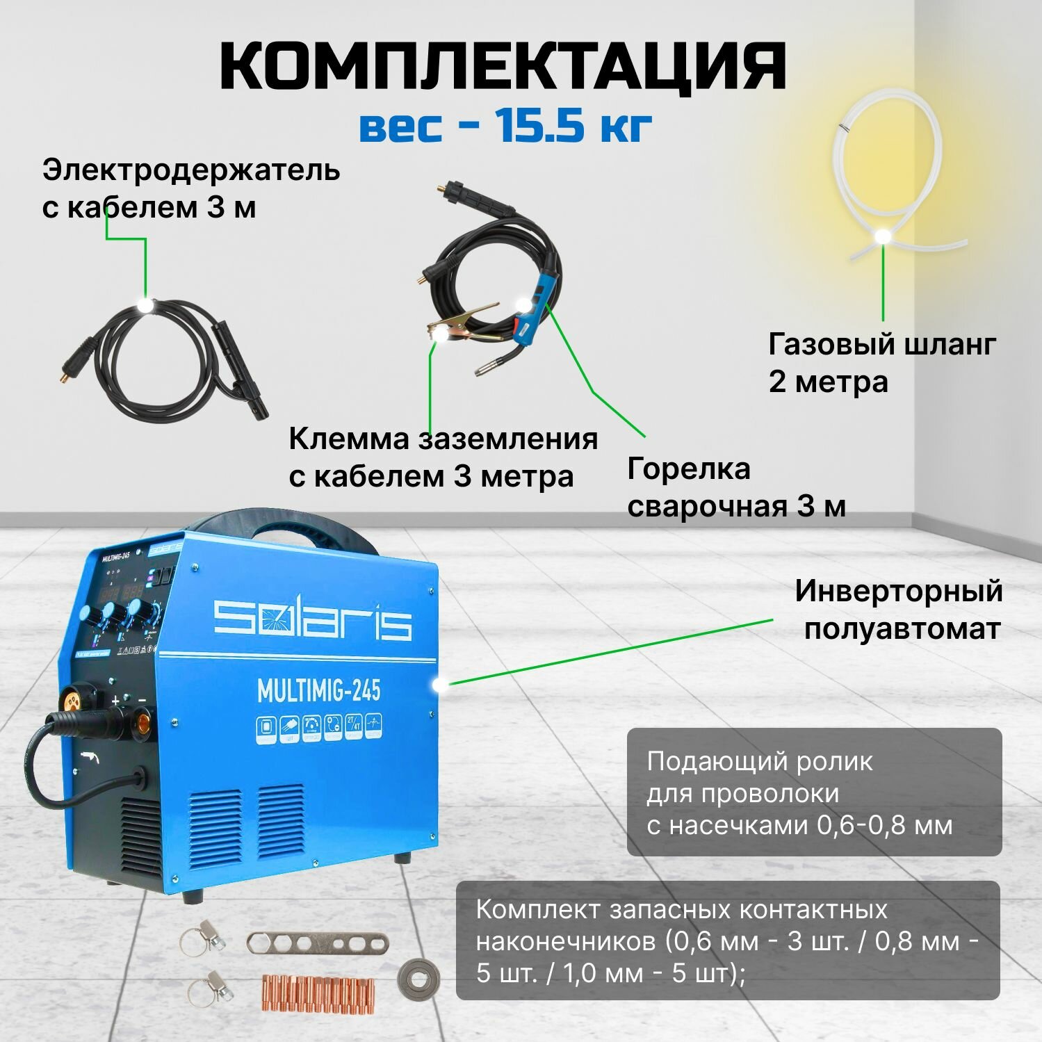 Полуавтомат сварочный Solaris MULTIMIG-245 (MIG/MMA/TIG) (220В; евроразъем; горелка 3 м; смена полярности; 2T/4T; рег-ка индуктивн.) (SOLARIS)
