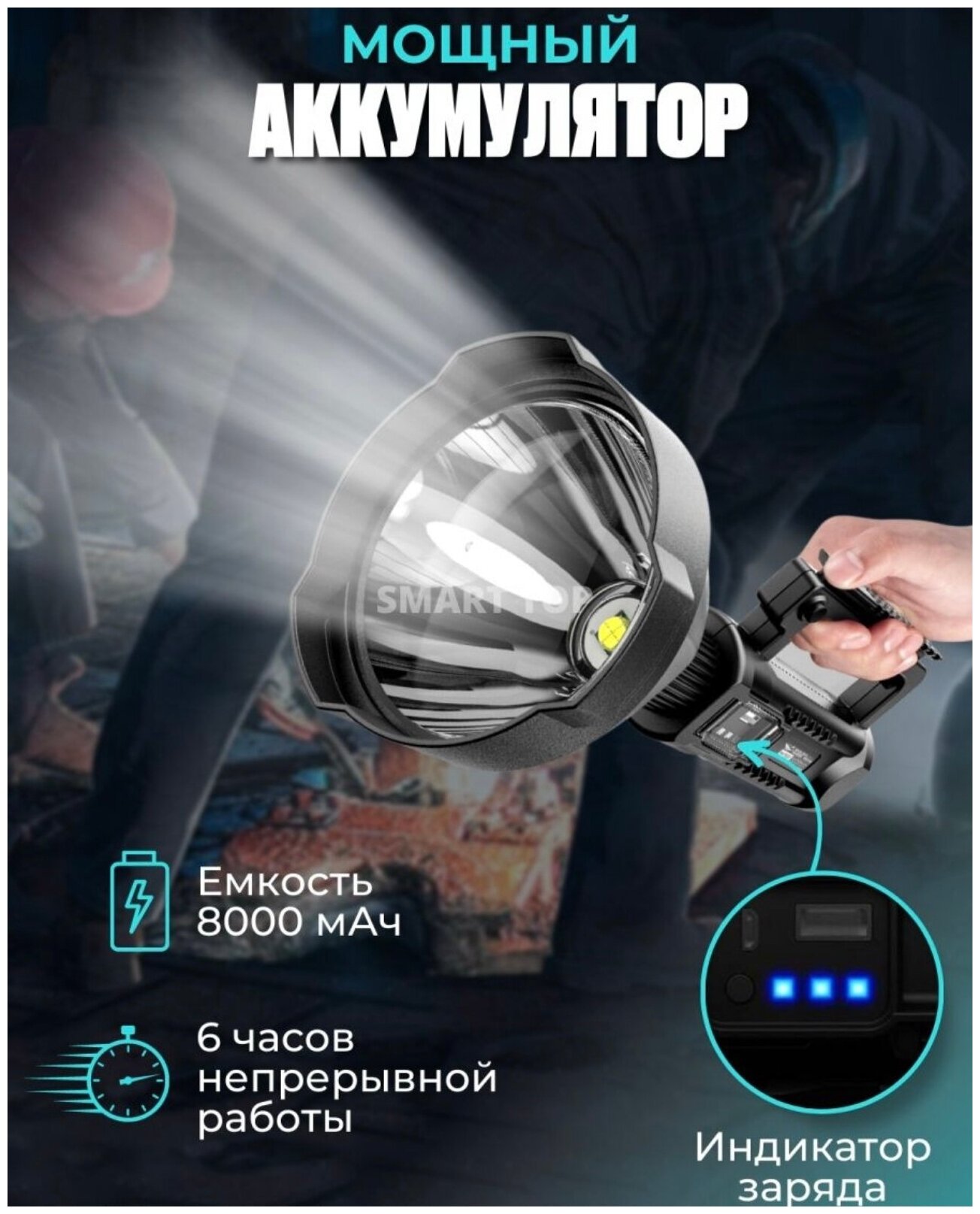 Очень хороший, яркий фонарик. Написано в характеристике. Светит 8 часов. Я проверял, светит более 12 часов. Яркий луч, светит точкой до 500 метров. Рекомендую. Очень хороший для рыбаки. Водонепроницаемый корпус. Есть зарядка для телефона, можно использовать как повербанк.
