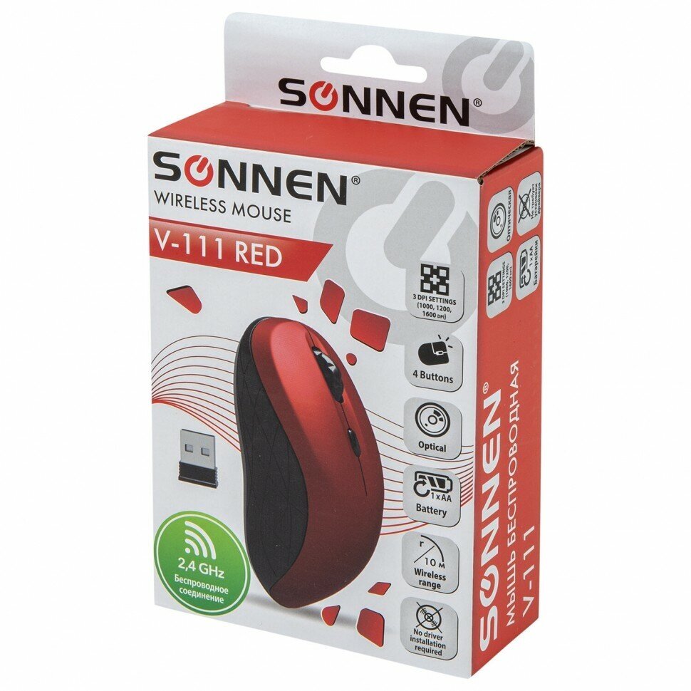 Мышь беспроводная SONNEN V-111 USB 800/1200/1600 dpi 4 кнопки оптическая красная, 1 шт
