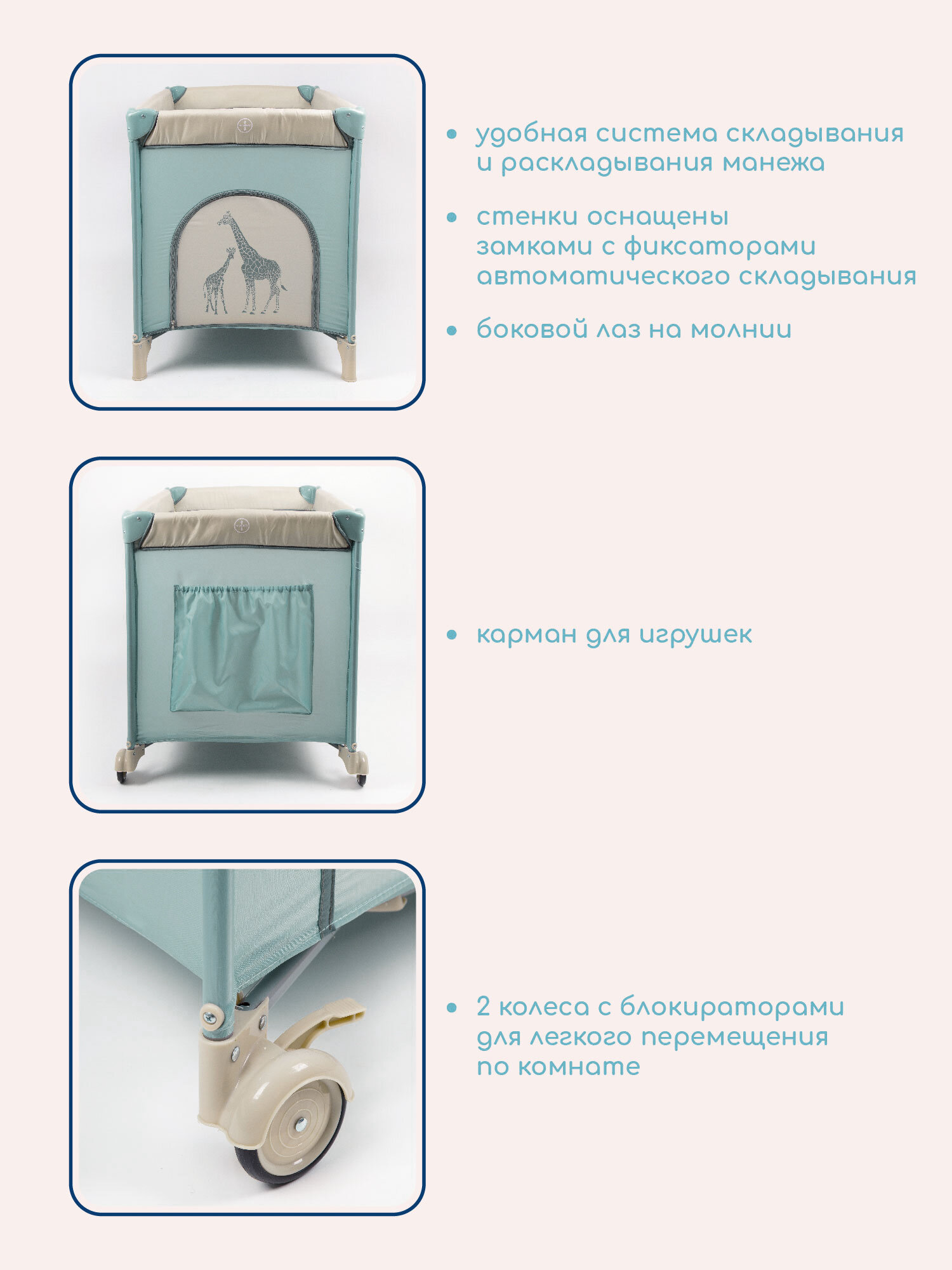 | Особенности | боковой лаз / карманы / можно использовать с рождения / регулировка высоты дна / с колесами / складной / стенки из ткани/сетки / фиксаторы колес |