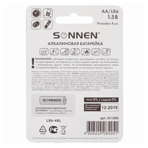 Батарейки SONNEN, AA (LR6), комплект 4 шт., алкалиновые, в блистере, 1,5 В, 451085