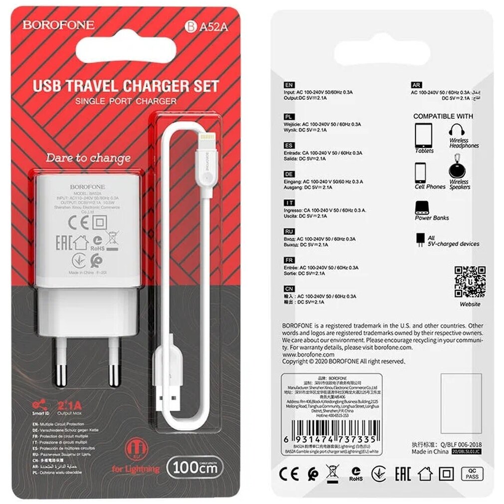 Сетевое зарядное устройство BOROFONE BA52A Gamble 1xUSB с Кабелем USB - Lightning, 2.1A, белый