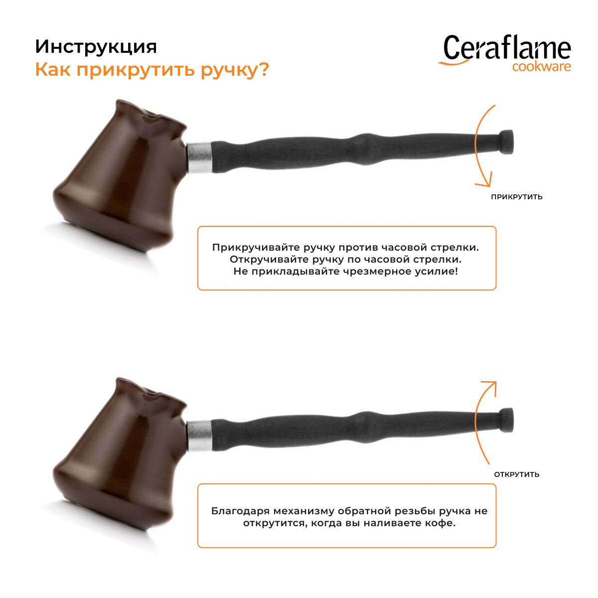 | Дополнительная информация | можно мыть в посудомоечной машине, предварительно открутив ручку; диаметр дна - 5 см, диаметр корпуса в самом широком месте - 7 см, высота корпуса - 8 см, диаметр горлышка по кромке - 4,5 см, диаметр горлышка в самой узкой части - 4 см; объем готового напитка составляет 130 мл.; ручка турки прикручивается против часовой стрелки; не прикладывайте чрезмерное усилие прикручивая ручку |