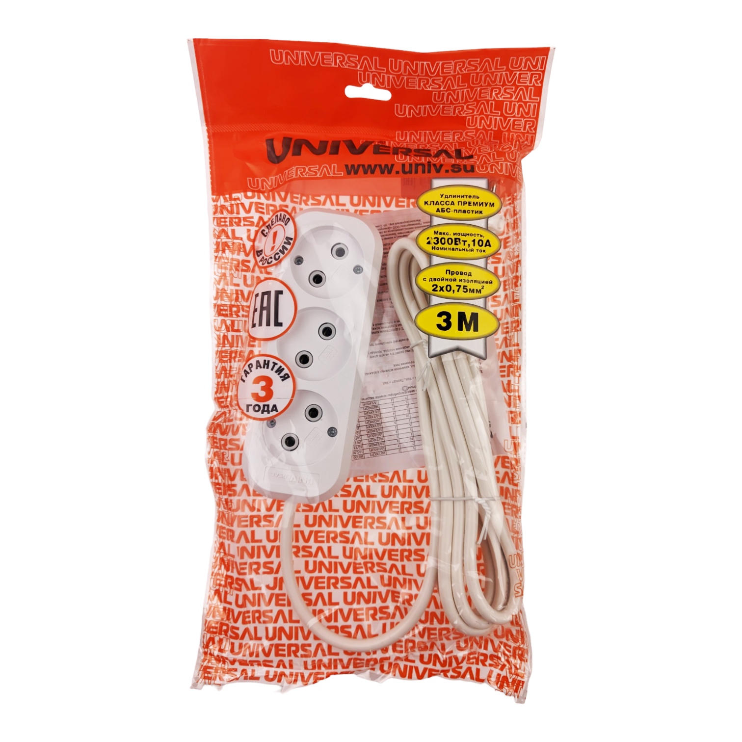 Сетевой удлинитель UNIVersal ПВС 2х0,75 3 роз. 3 м 10А (корпус АБС-пластик) E-203 1964
