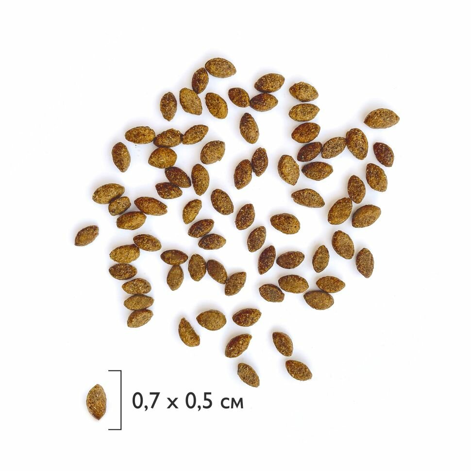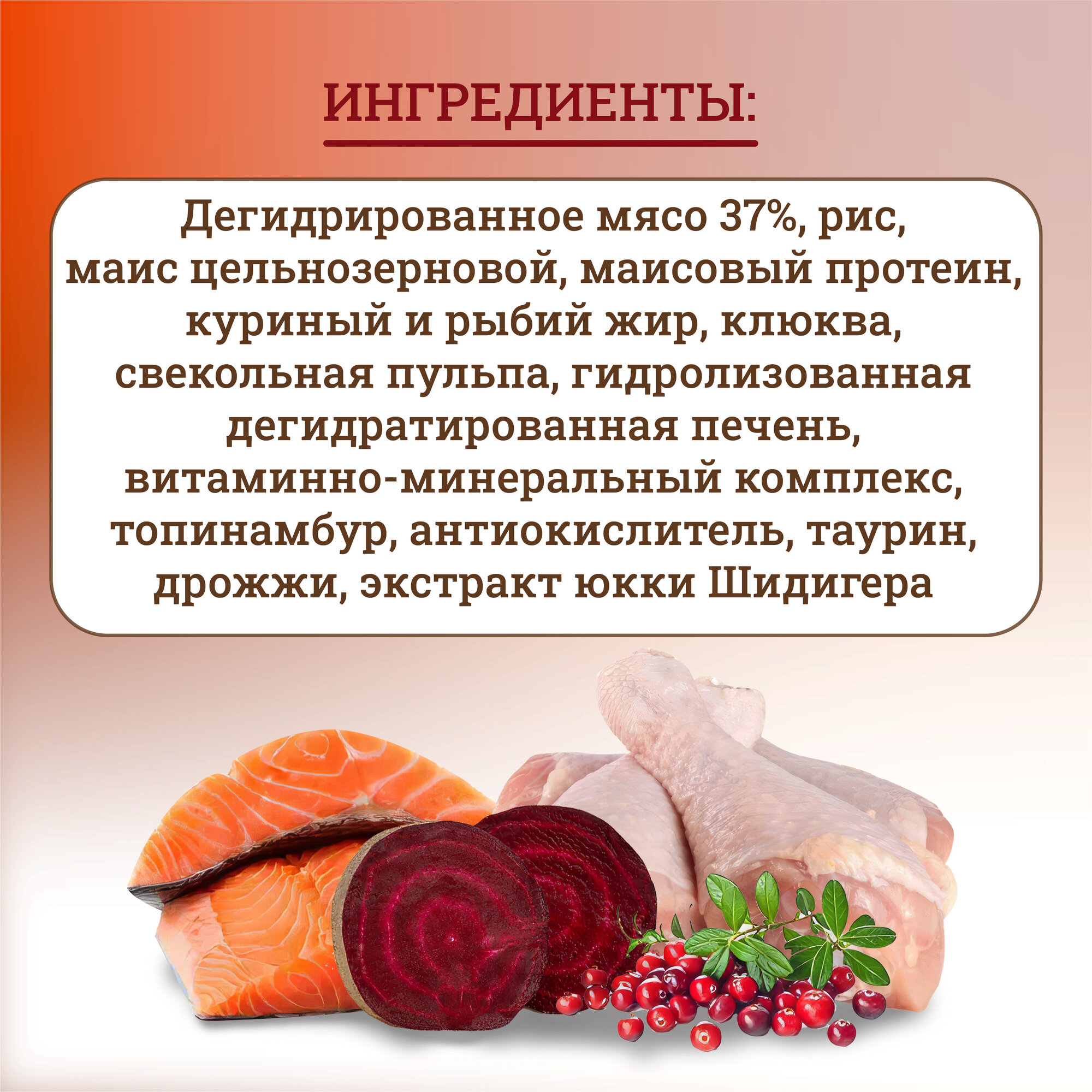| Состав | дегидрированное мясо 37% (лосось, курица), кукуруза, глютен кукурузный, рис, жир куриный, свекольная пульпа, гидролизованная и дегидратированная печень 3%, дрожжи (источник маннанолигосахаридов), витаминно-минеральный комплекс, таурин, топинамбур (источник инулина – фруктоолигосахаридов), клюква, DL-Метионин, антиокислитель, экстракт юкки Шидигера |
