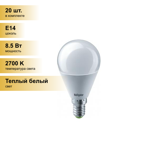 1шт. - Лампа светодиодная LED 8.5вт Е14 теплый шар / Navigator Group; арт. 61333 NLL-G45; оригинал / - комплект 1шт