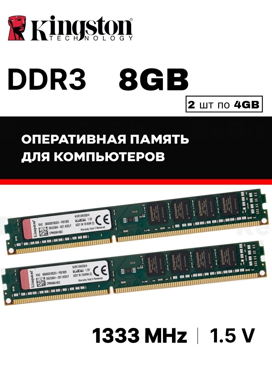 Оперативная память Kingston ValueRAM 8 ГБ (4 ГБ x 2 шт.) DDR3 1333 МГц DIMM CL9 KVR13N9S8K2/8