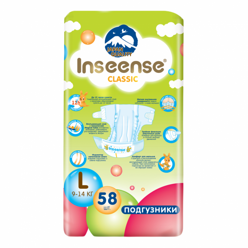 Подгузники Inseense Classic+ L (9-14 кг) 58 шт