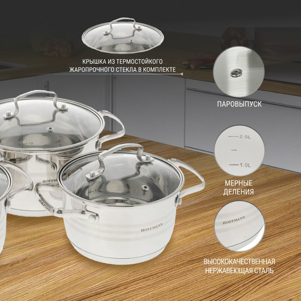 Набор посуды нержавеющая сталь, 6 предметов, кастрюли 2.1,3.1,4.1 л, индукция, Hoffmann, НМ 5106. 431122