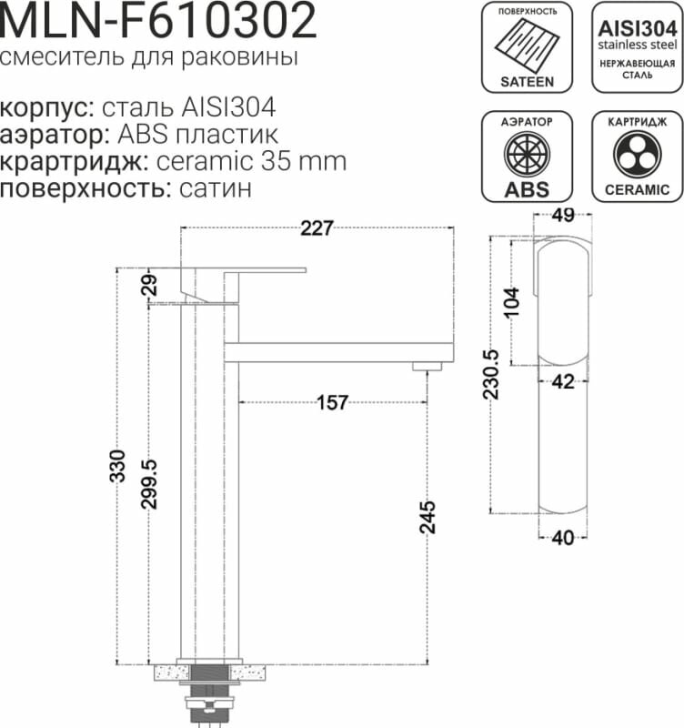 Смеситель для умывальника MELANA Stello нерж.сталь, однорычажный, сатин, литой излив 610302 интересное: