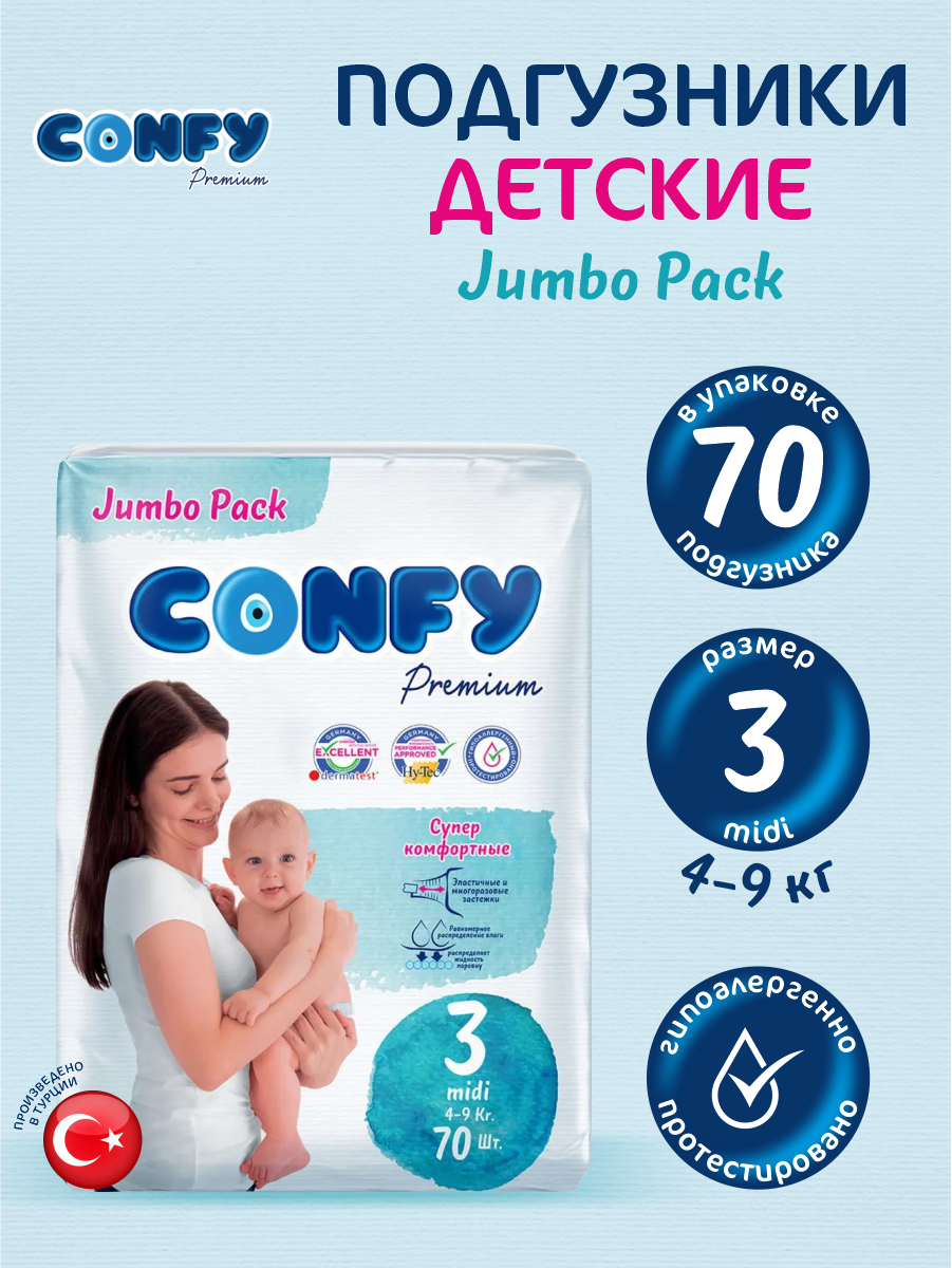 Подгузники Confy Premium Midi детские для девочек и мальчиков, 3 размер 4-9 кг, 70 шт