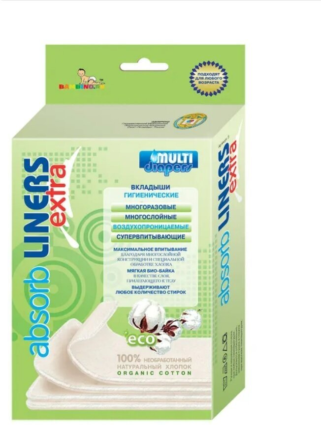 | Дополнительная информация | 4-х слойные вкладыши; состоят из двух наружных слоёв ворсованной биобайки, изготовленной из необработанного органического хлопка, и двух внутренних впитывающих слоёв из натурального хлопка с добавлением волокон бамбуковой вискозы; размер 125 х 330 мм |