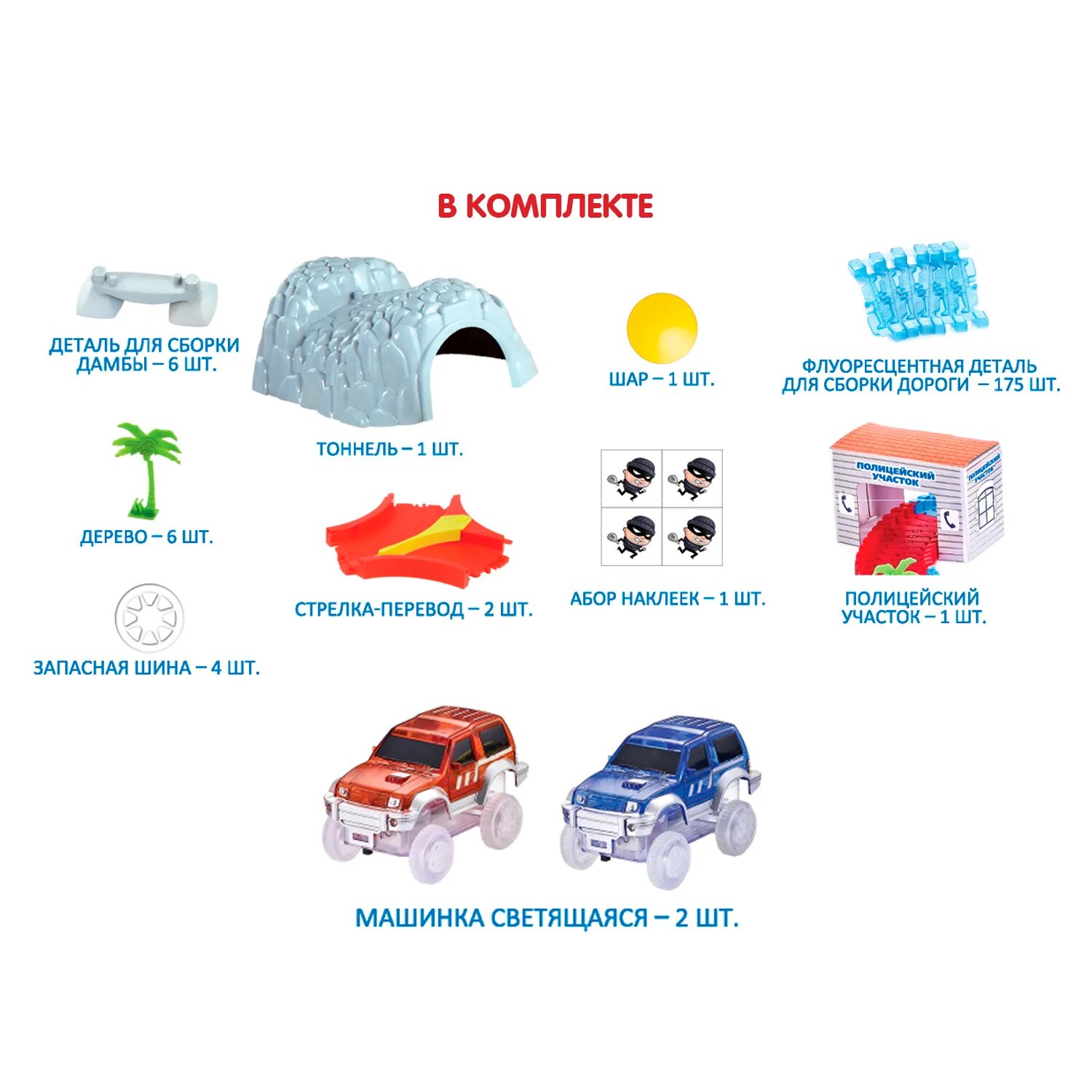 | Комплектация | - детали для сборки дамбы 6 шт.; - тоннель 1 шт.; - деревья 6 шт.; - стрелка-перевод 2 шт.; - шар 1 шт.; - флуоресцентная деталь для сборки дороги 175 шт.; - набор наклеек; - полицейский участок 1 шт.; - светящиеся машинки 2 шт. |