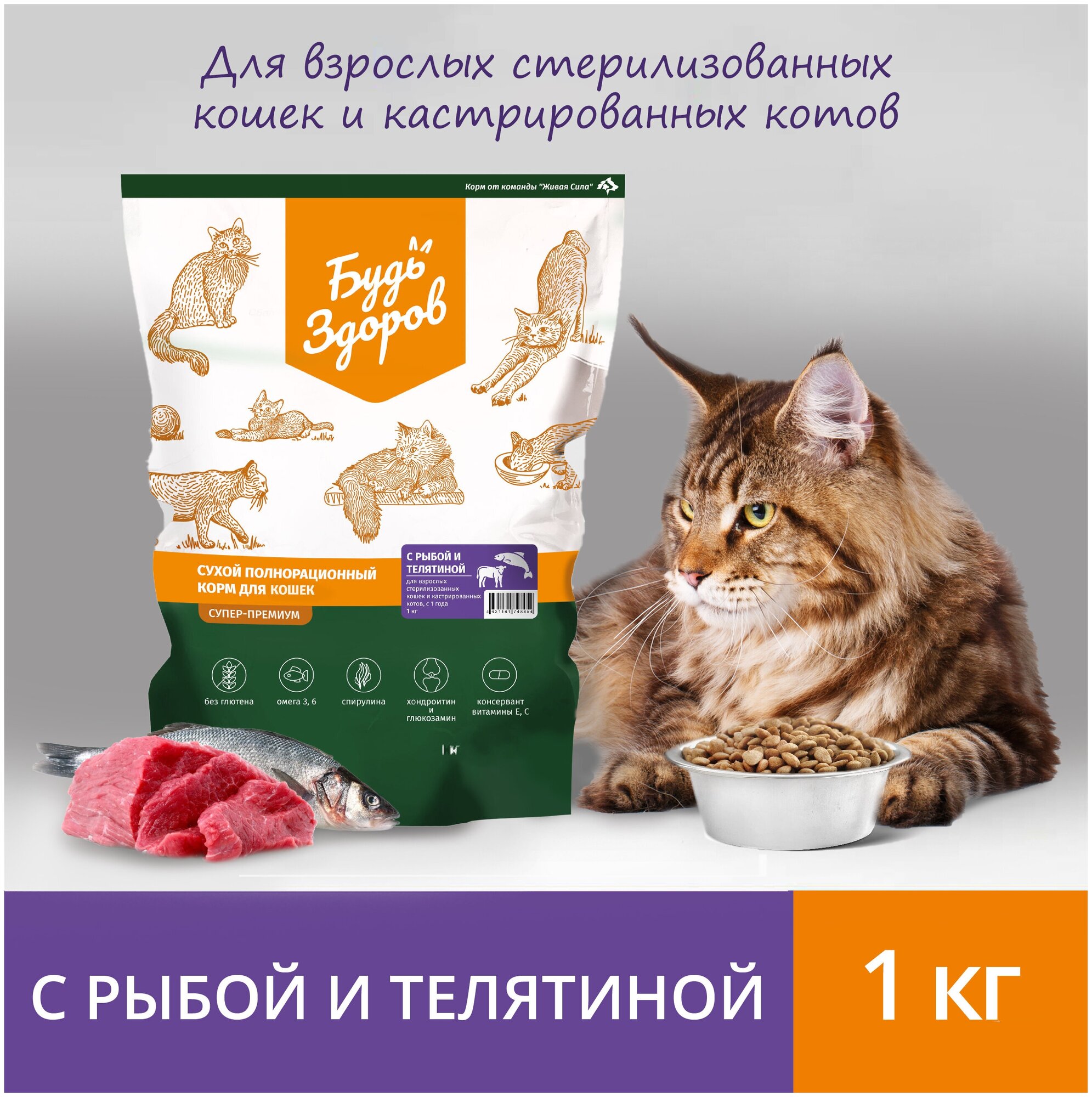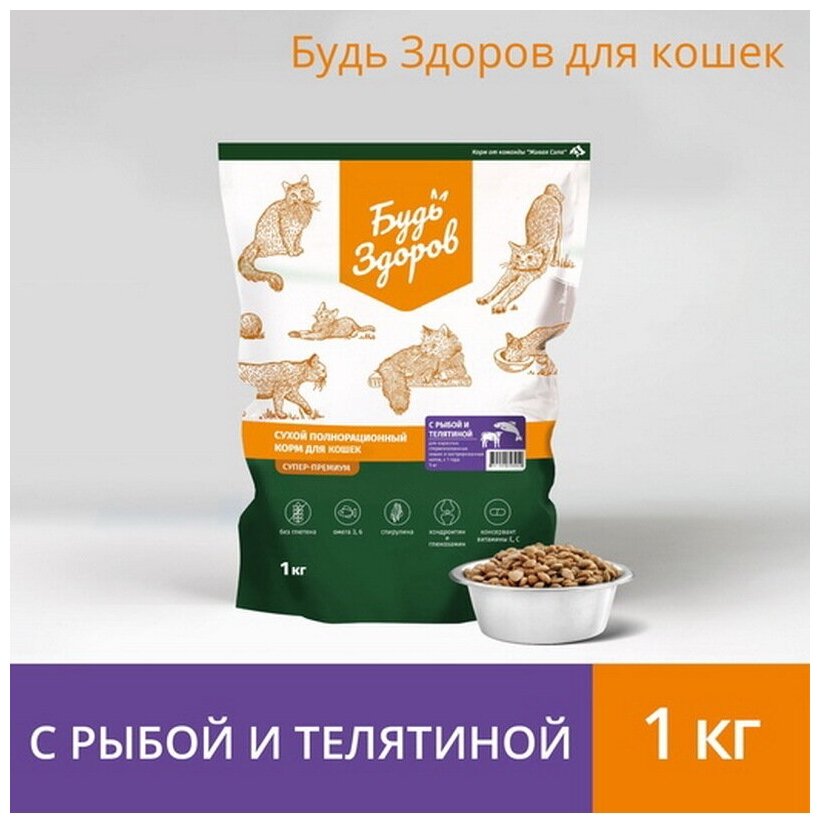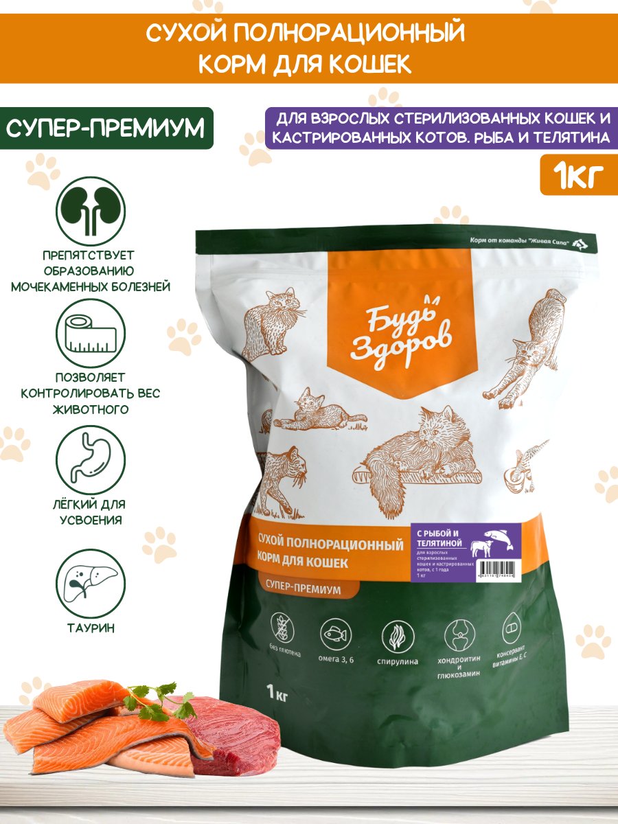 Будь Здоров сухой полнорационный корм с телятиной и рыбой для стерилизованных кошек, кастрированных котов (1 кг)