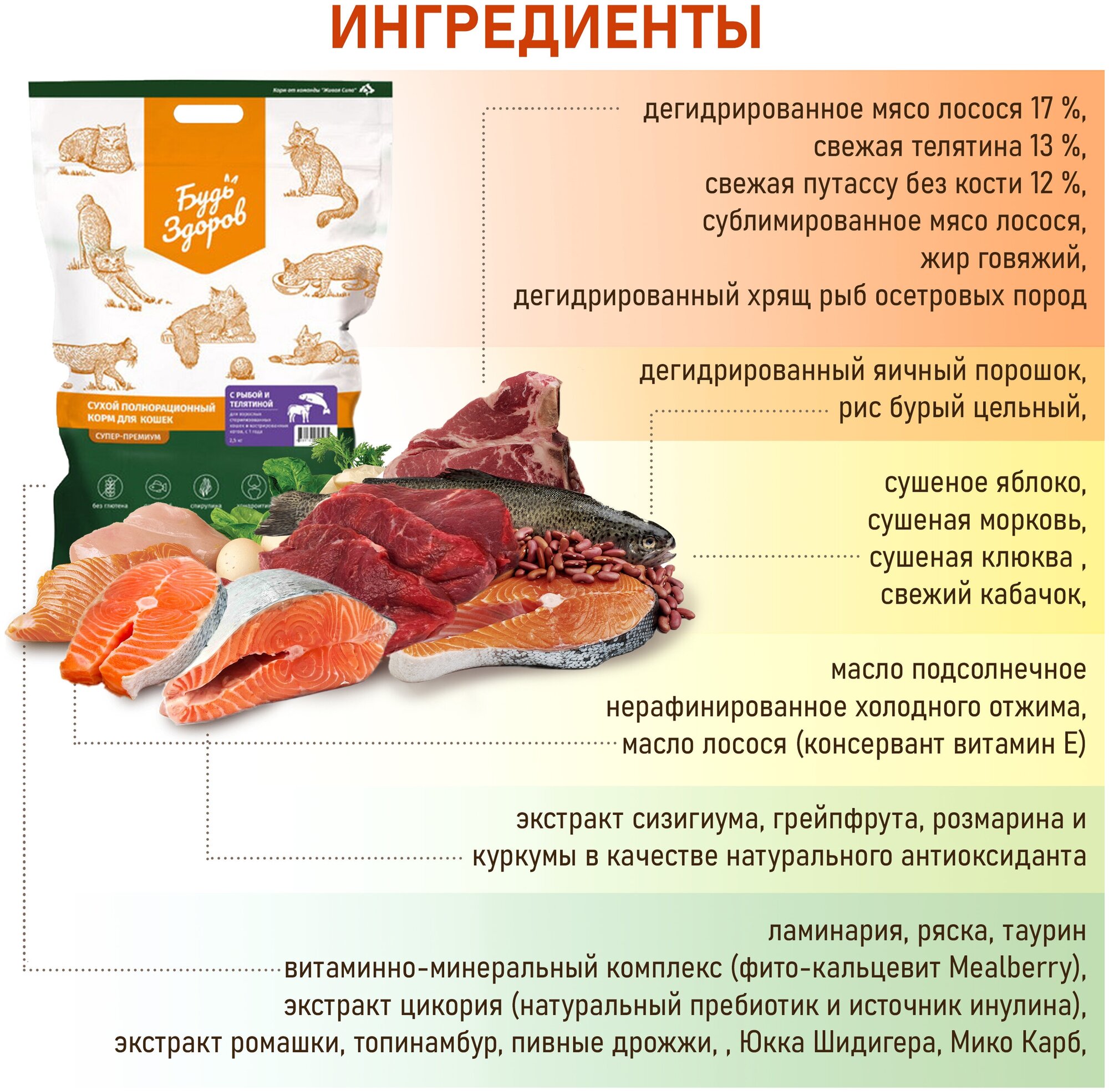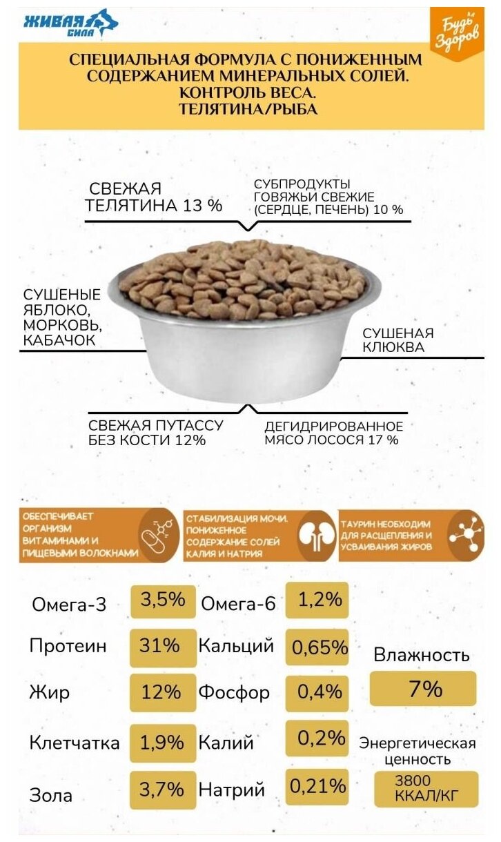 | Состав | дегидрированное мясо лосося 17 %, свежая телятина 13 %, свежая путассу без кости 12 %, рис бурый цельный, сублимированное мясо лосося, жир говяжий, сушеное яблоко, сушеная морковь, свежий кабачок, сушеная клюква (стабилизация мочи), дегидрированный хрящ рыб осетровых пород (источник глюкозамина и хондроитина), экстракт ромашки, топинамбур, ламинария, ряска, масло лосося (консервант витамин Е), нерафинированное подсолнечное масло холодного отжима, витаминно-минеральный комплекс (фито-кальцевит Mealberry), экстракт цикория (натуральный пребиотик и источник инулина), пивные дрожжи, таурин, Юкка Шидигера, Мико Карб, экстракт сизигиума, грейпфрута, розмарина и куркумы в качестве натурального антиоксиданта |